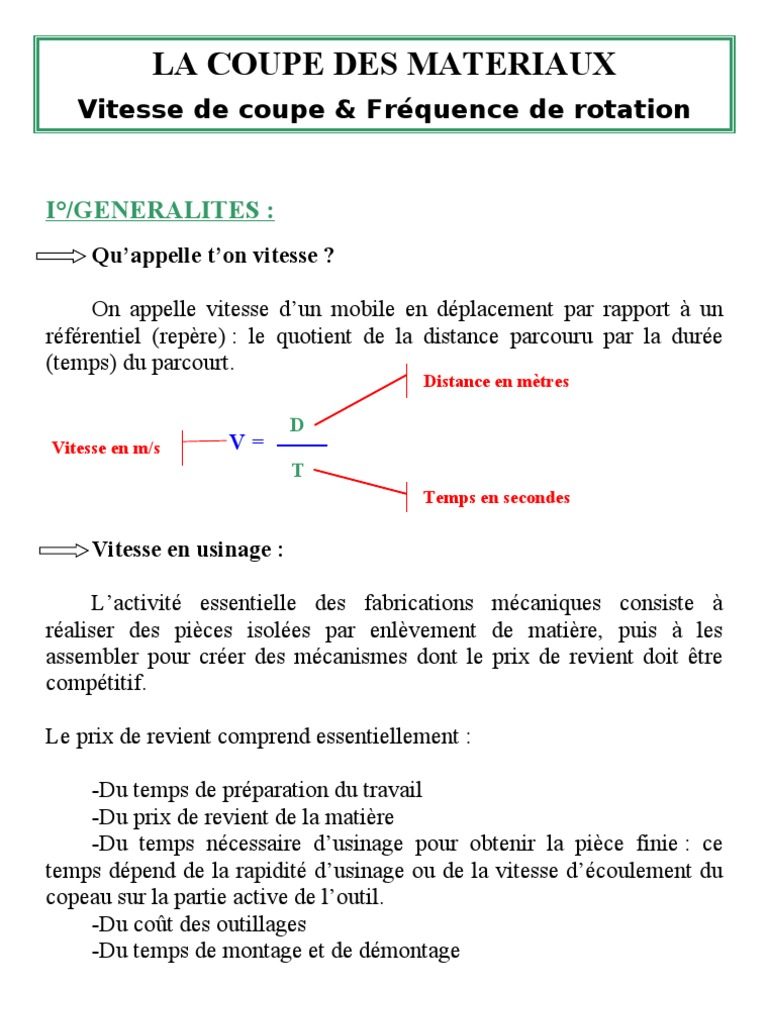 Allure et vitesse sont liées avec la distance et le temps. Ainsi a été développée une technique qui permet de déterminer la vitesse de coupe, la profondeur de passe et l'avance. Zapping onze mondial ligue 1 : Il existe deux catégories dans cette discipline. Les formules ne sont pas complexes mais demandent un peu de gymnastique.